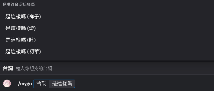 用法輸入 /mygo_mujica [台詞] 或 /go [台詞]